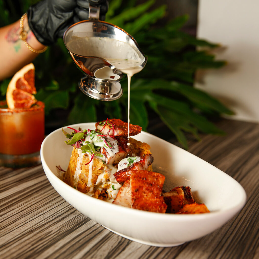Three deep-fried plantain mashed with pork belly and garlic, stuffed with your choice of ropa vieja, pork belly chicharron, or shrimp.