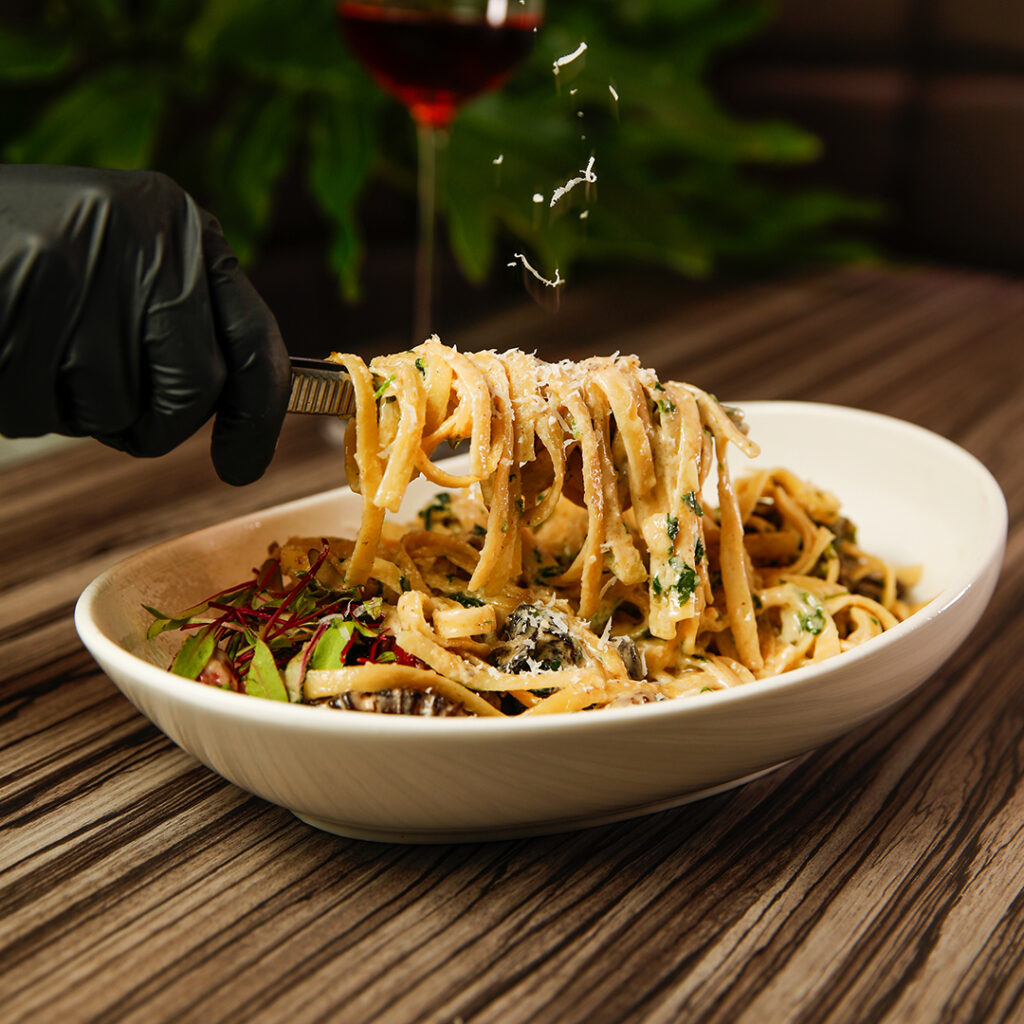Fettuccine pasta with grilled skirt steak, mushrooms, crispy bacon, in a creamy bechamel sauce and parmesan cheese.